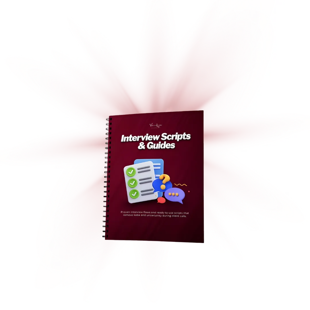 Proven interview flows and ready-to-use scripts that remove kaba and uncertainty during client calls.